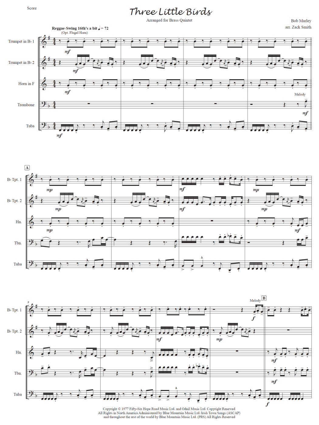 This is a cool brass quintet arrangement of the reggae classic. Everyone gets a piece of the